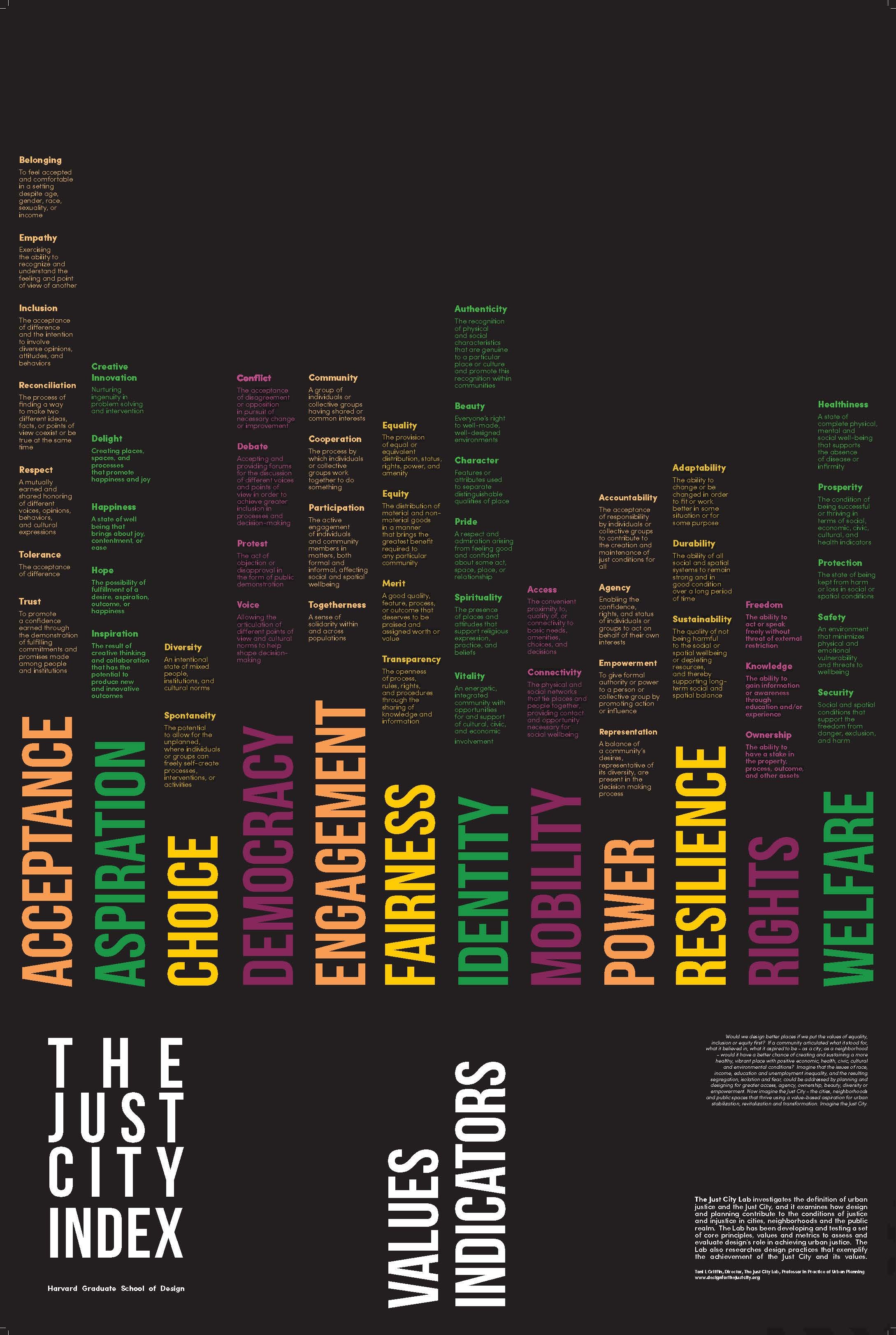 The Just City Index is a framework of 50 values, to be used as a tool for communities to establish their own definition and principles for what make each city or neighborhood more just. To define your Just City, explore the Index and our set of engagement tools.